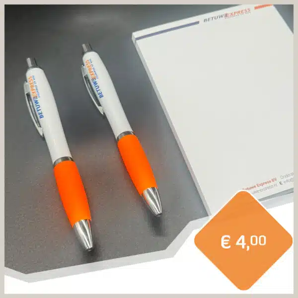 Handige en stijlvolle set bestaande uit twee pennen en een notitieblokje, beide voorzien van de naam en het logo van Betuwe Express. Ideaal voor dagelijks gebruik op kantoor, onderweg of thuis.
